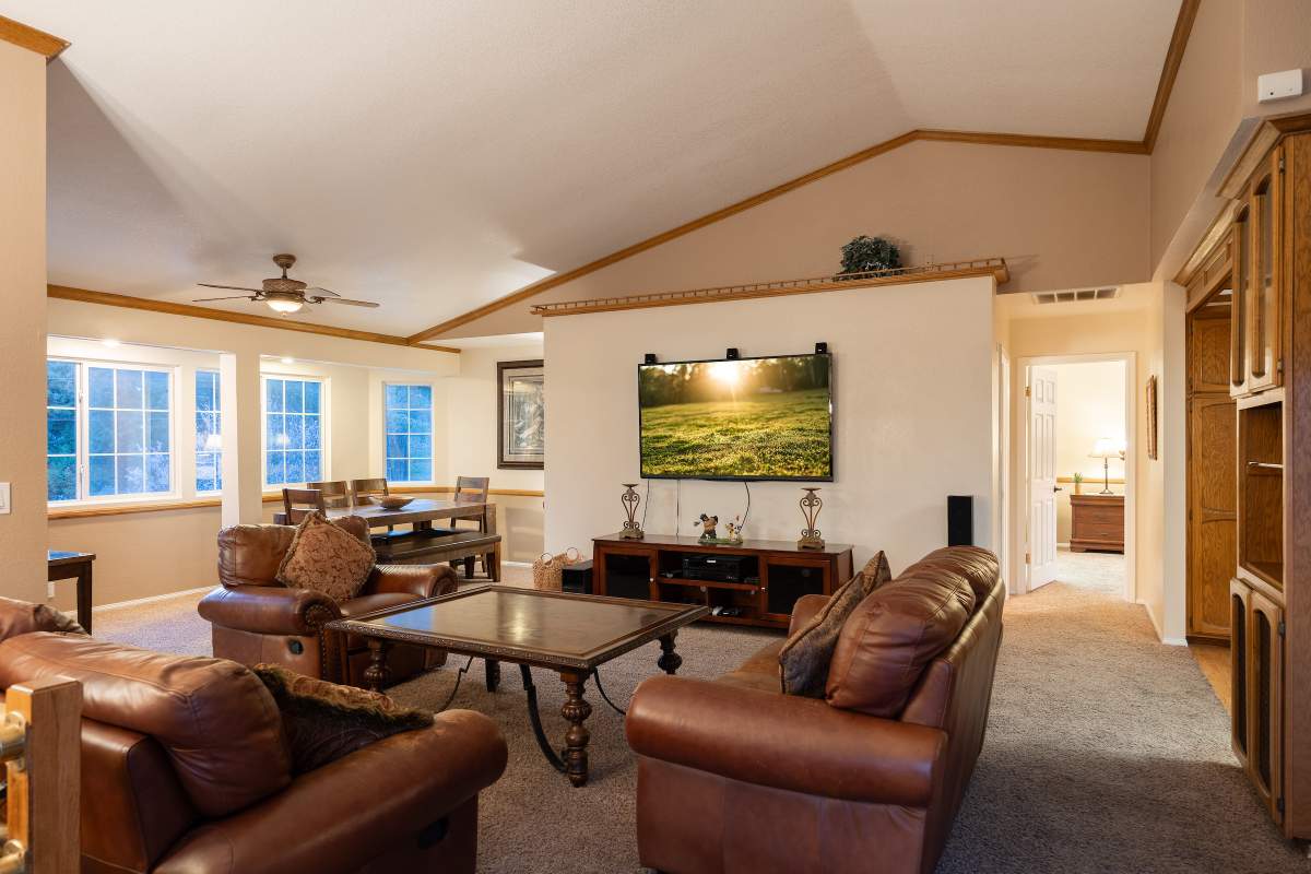 Beautiful custom golf course home with unobstructed views of the 4th hole fairway and located just down the street from Bear Mountain Resort. Room for a crowd, this home features 4 bedrooms, 3 baths, a spacious great room/family room, plus a sunroom with abundant windows and a spacious deck to take in the view and stunning sunsets. Main bedroom accesses a private balcony, en suite bath has dual vanity, jetted tub and walk-in shower. Main level kitchen has an island, breakfast bar and dining area. There is a second kitchen on the lower level which opens to the patio allowing for effortless entertaining. Laundry room on lower level as well. Seller has put over $60,000 in upgrades including all new exterior paint, partial new roof, new bathroom tile, and refreshed all exterior masonry. Huge garage for your vehicles and toys, plus plenty of concrete parking with room for boat or RV. Easy all-season access so close to the slopes, to the newly renovated Moonridge Corridor and zoo, and a short drive to the lake, shopping, and dining. Has been a successful vacation rental for obvious reasons. Start making your mountain memories today.