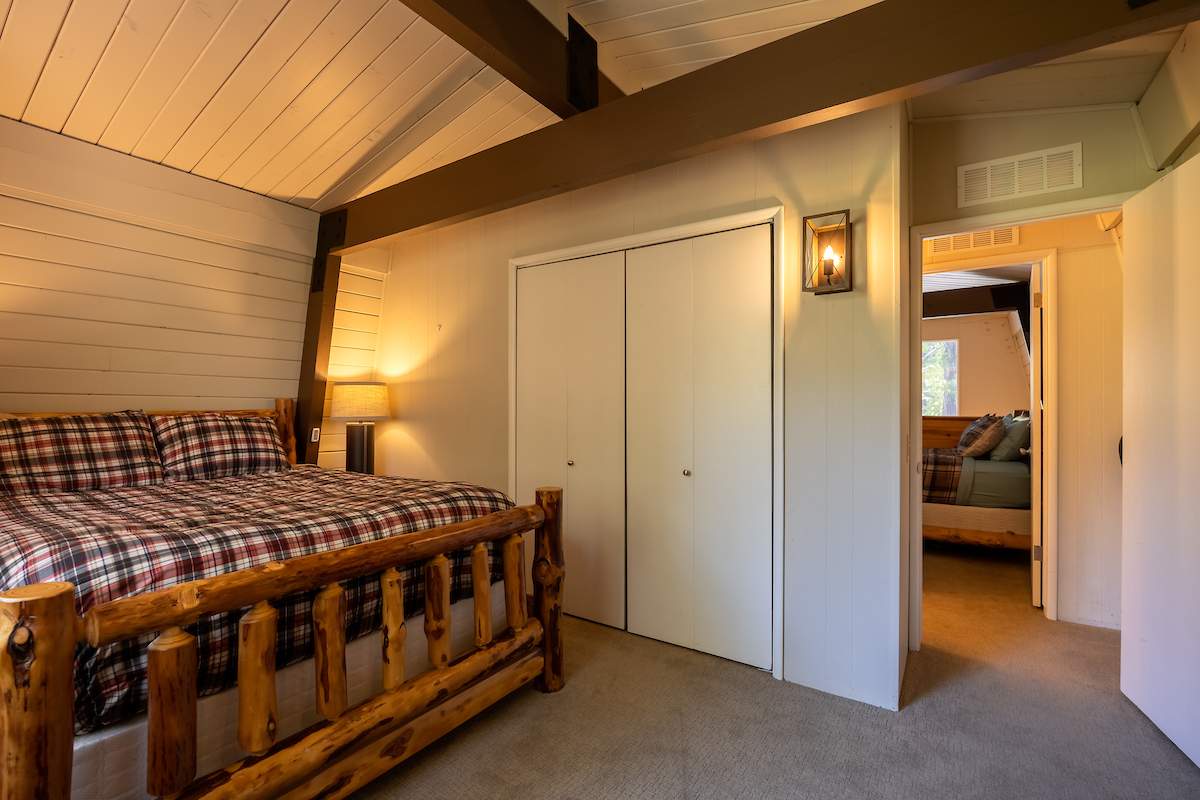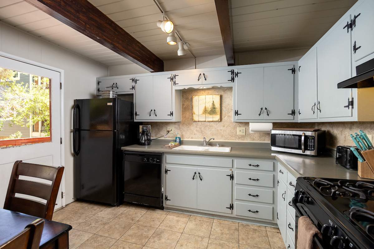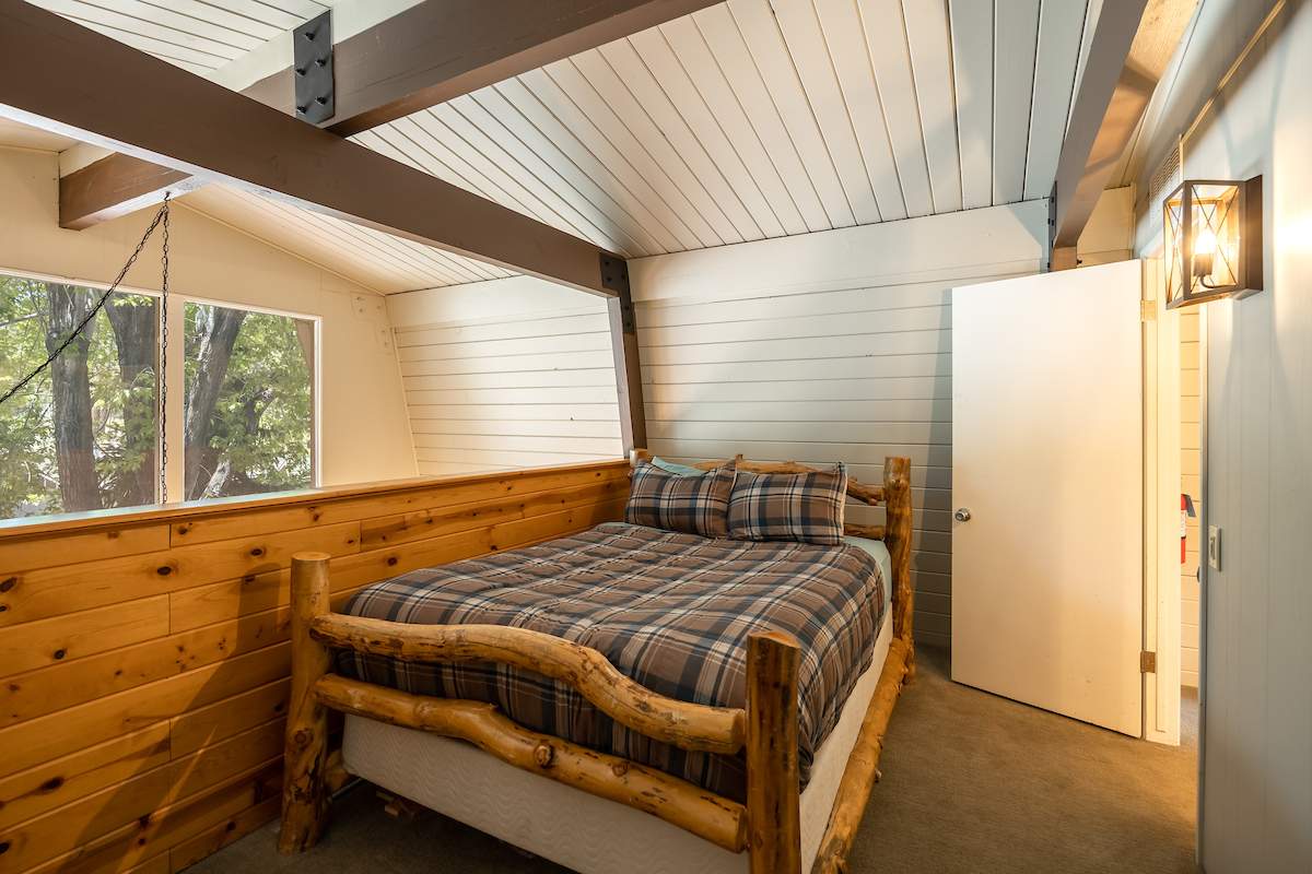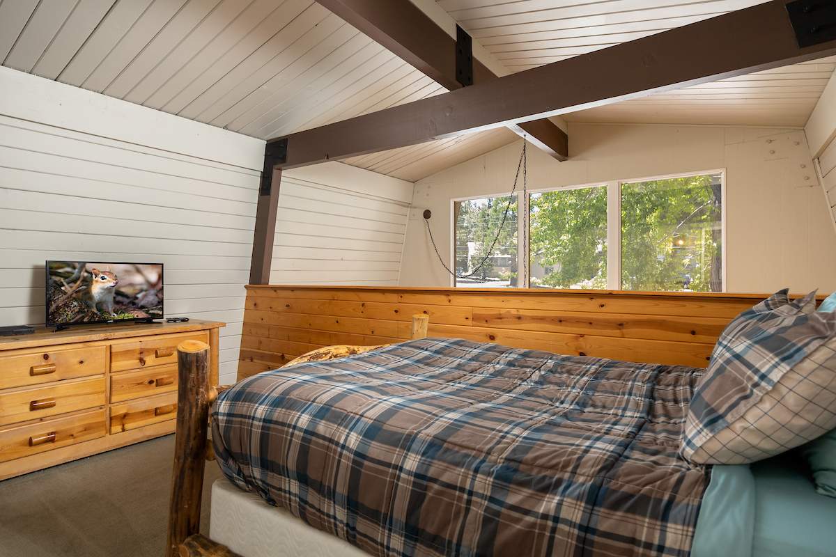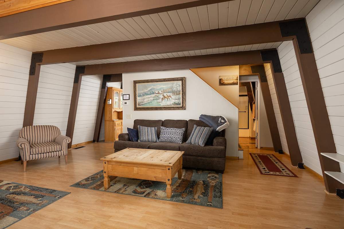 Awesome central Big Bear Lake location so close to the lake and less than one mile from the village. Popular full-roof gambrel-style cabin featuring high beamed ceilings, a cozy brick fireplace, and laminate flooring. Eat-in kitchen with all the amenities. Remodeled bathroom on main level with custom vanity and glass shower doors. Two bedrooms upstairs, one is loft-style. Newer central forced air furnace and water heater. Newly added high powered exhaust fan upstairs to keep cabin cool in the warm summer months. Enjoy the fresh mountain air out on the spacious redwood deck which surrounds the home on three sides. Easy all-season access and level parking. Has been a highly successful vacation rental. Turnkey and ready to enjoy today!