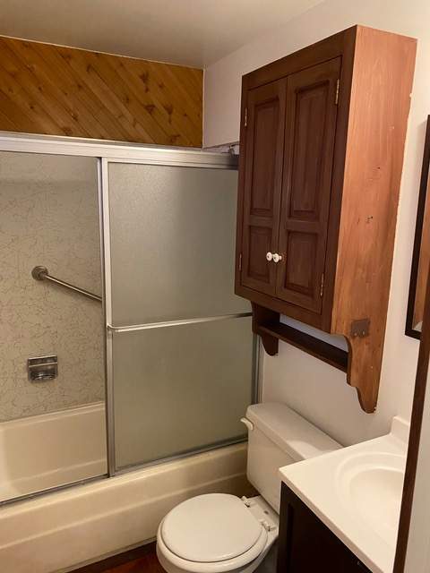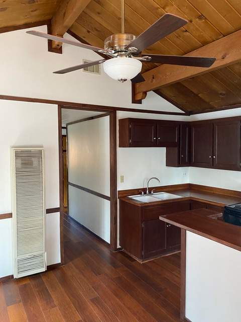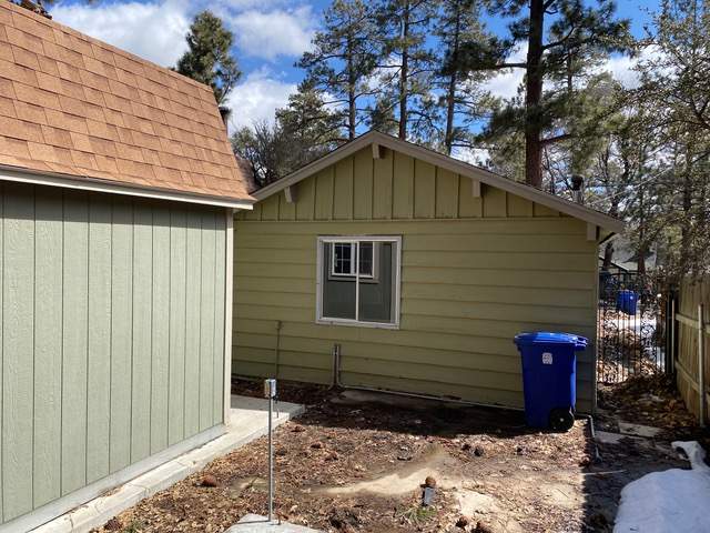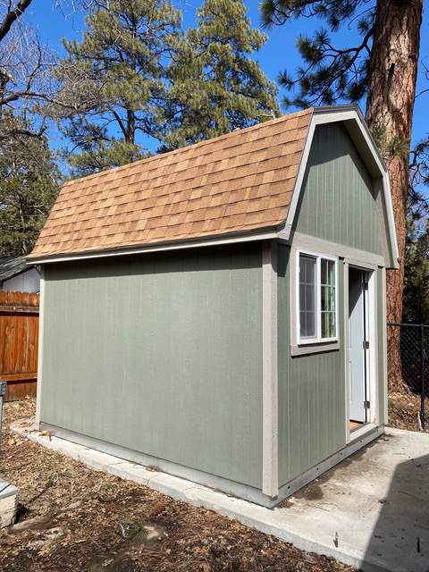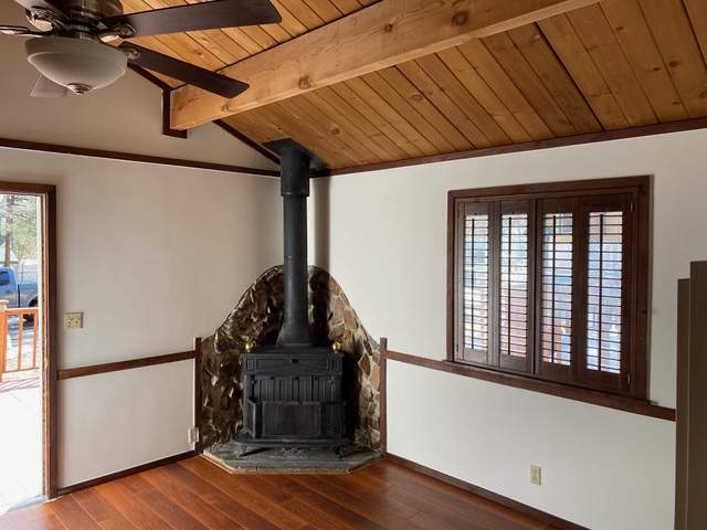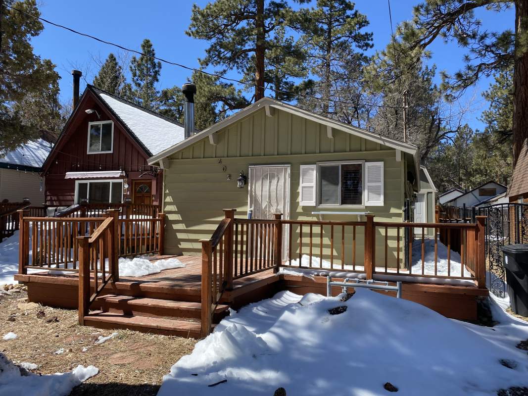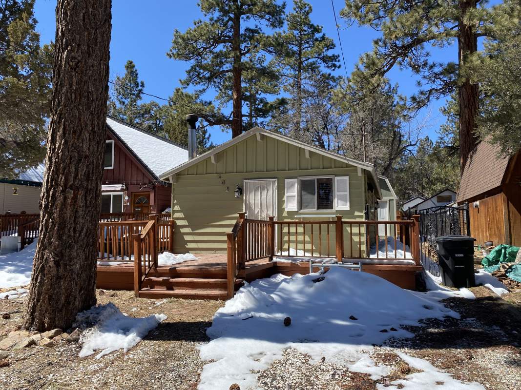 Popular chalet-style cabin, comfortable single level in upper Sugarloaf near national forest. Wood beamed ceilings and durable wood laminate style flooring. Efficient Franklin stove in the living room. Kitchen has custom cabinetry offering plenty of storage plus a breakfast bar. Fresh interior paint and bedrooms have new carpet. Windows feature wood plantation shutters. Laundry hookups for a stacker washer/dryer. Huge quality storage shed in the fenced back yard plus a concrete slab for patio or spa. This property was purchased by current owner at foreclosure post auction bid pursuant to SB 1079. SB 1079 was put in place to promote homeownership and therefore priority for offers are given to owner occupant buyers.