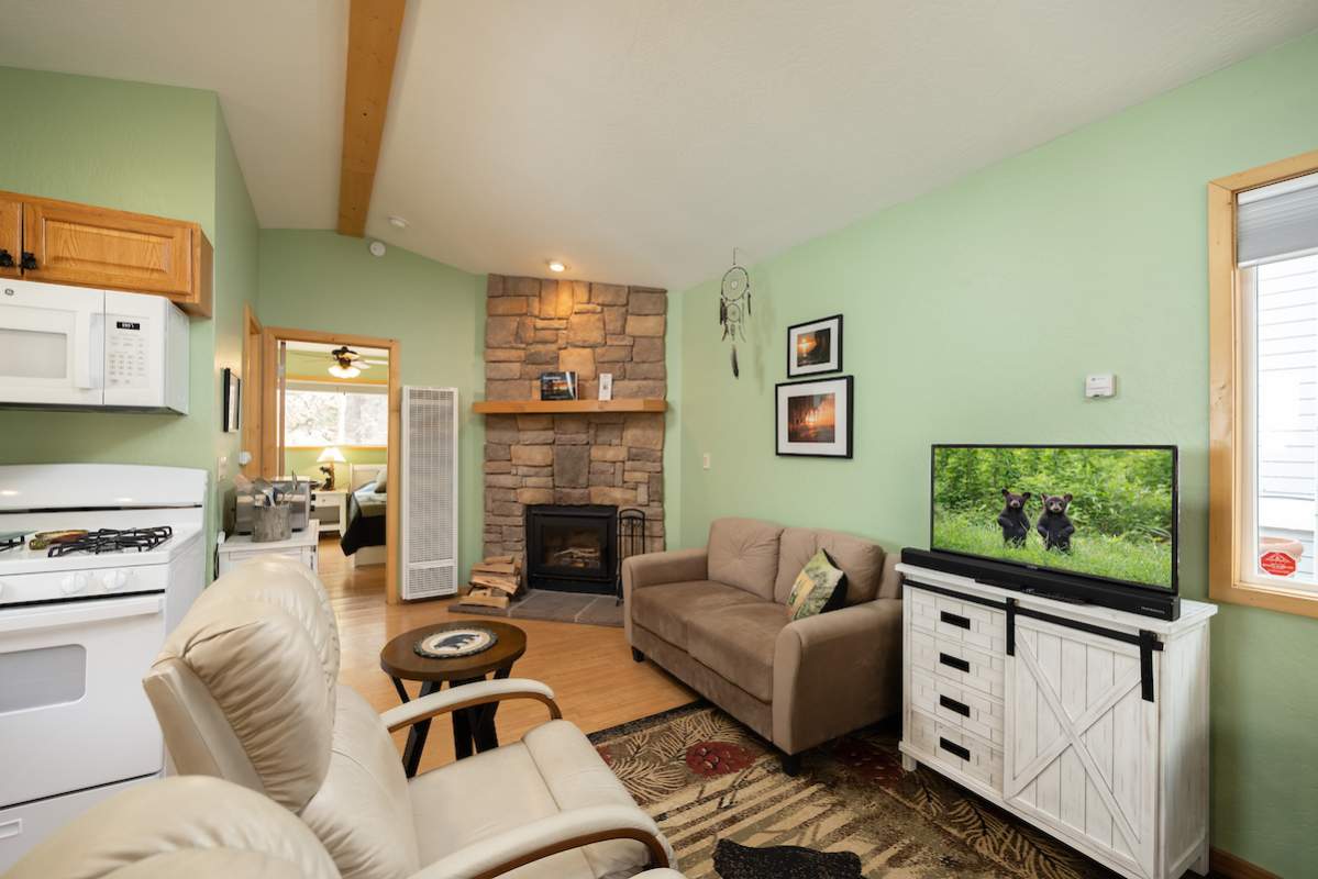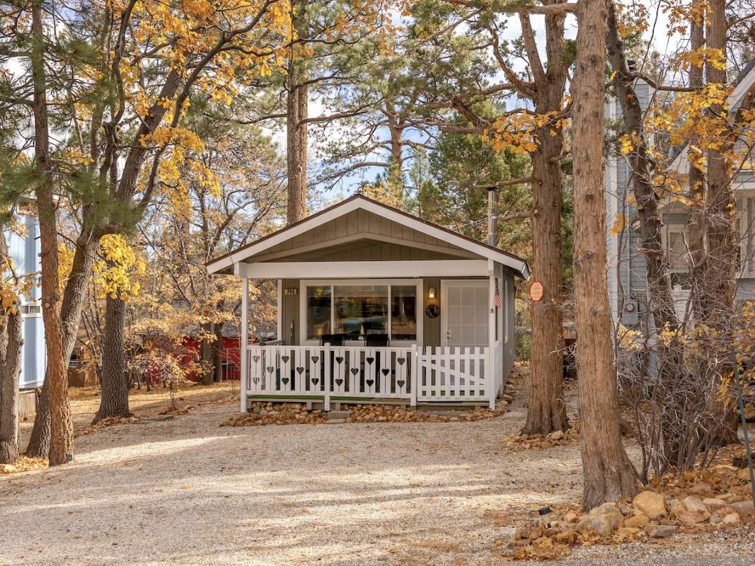 Tiny cabin alert! Located in upper Sugarloaf close to national forest, this cheery chalet is ready to enjoy today. Lovingly updated and fully furnished. New windows & doors, blinds, interior paint, appliances, water filter under the kitchen sink, portable air conditioner. Laminate floors, recessed lighting in the kitchen, ceiling fans in the living room and bedroom. Wood burning fireplace. Smart and efficient use of space. Stacker washer/dryer. Property is landscaped with trees, bushes, creeper vine, on a drip system, the two larger trees at the front of the property are lit at night. Sip your morning coffee out on the covered front porch, which also has a retractable sun shade. Store your firewood and tools in the attached storage shed. Enjoy peace of mind – there is an emergency water sprinkler on the roof and a sturdy security entry door. Easy all-season access and level parking on the gravel driveway. Make this turnkey cabin your awesome weekend getaway and/or excellent vacation rental investment property. Current rental income projection from top local management company on file: $22K.