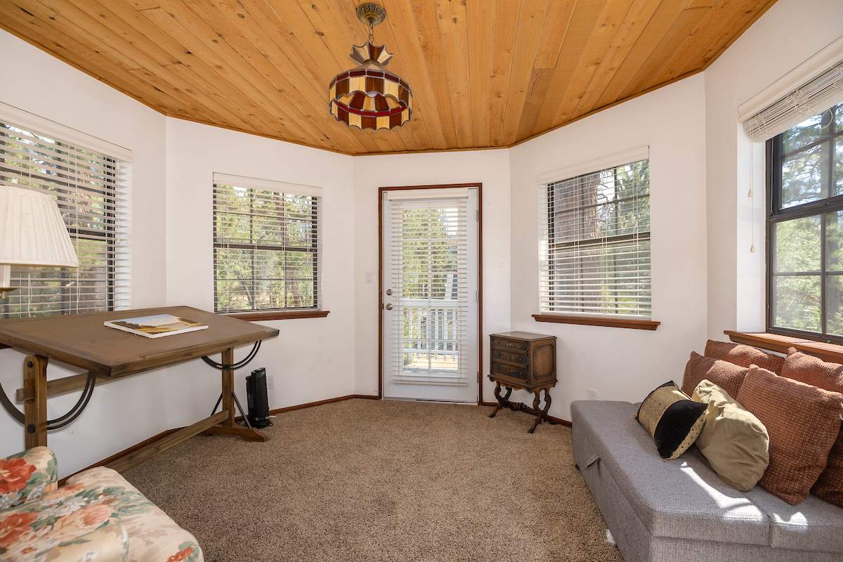 Stellar location for this updated Fox Farm home in Alpine Woods Estates. Situated above street level on nearly a 1/3 acre corner lot with detached 2-car garage. Great room open concept floor plan, beamed ceilings with recessed lighting and skylights, laminate flooring, impressive brick fireplace with sunken seating area. Remodeled kitchen features a large island, plenty of counter top and storage space, stainless appliances; adjacent dining area w/bay windows. Gaze at the constellations while soaking in the spa, built into the back deck. All living areas, bedrooms, baths, etc., are on one level, with the exception of a “fox tower” turret accessed by a spiral staircase; could be used as an artist’s loft, study, office, or additional sleeping area; has it’s own balcony. Centrally located near all that beautiful Big Bear has to offer, furnished and turnkey, ready for you to start making your memories in the mountains today.