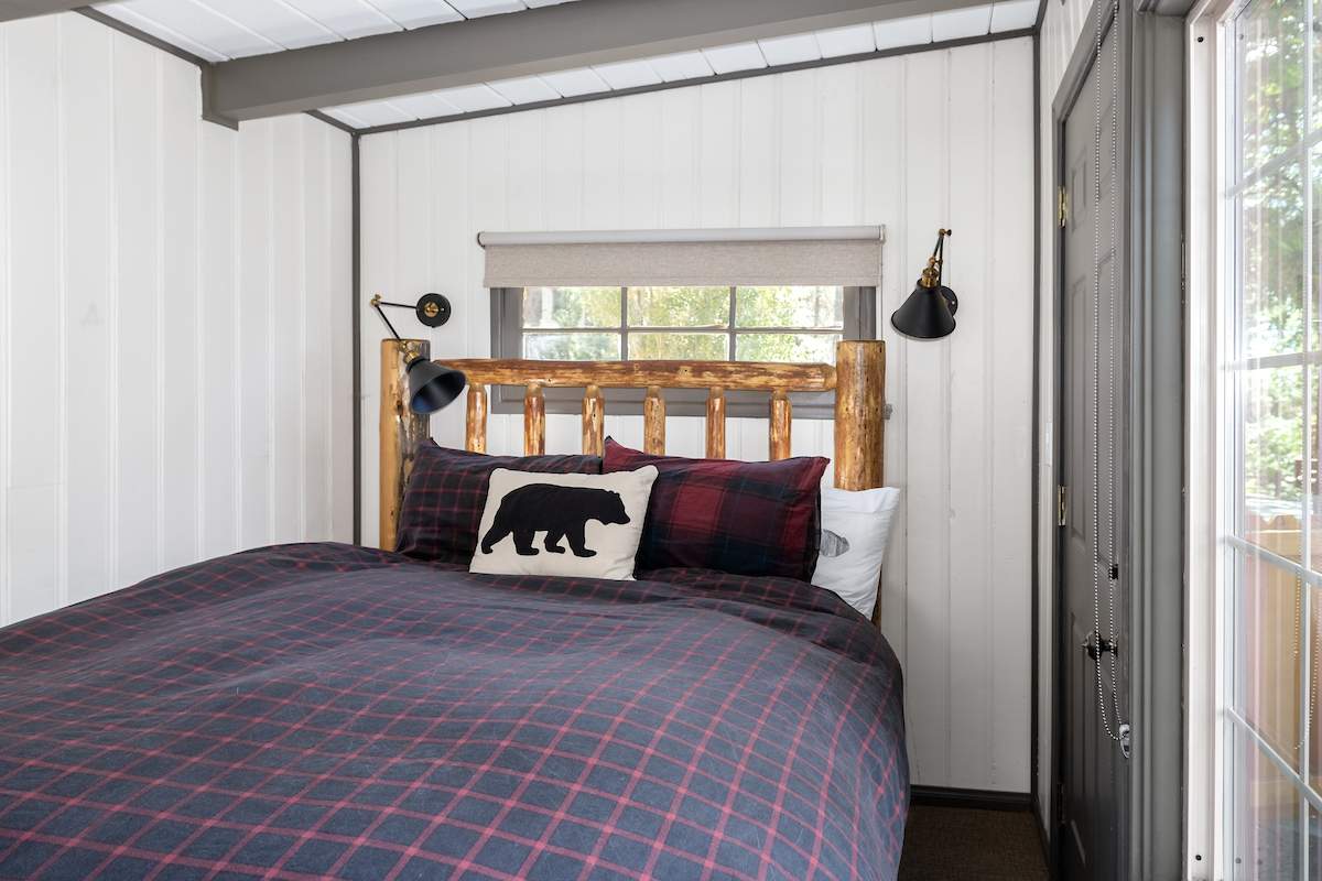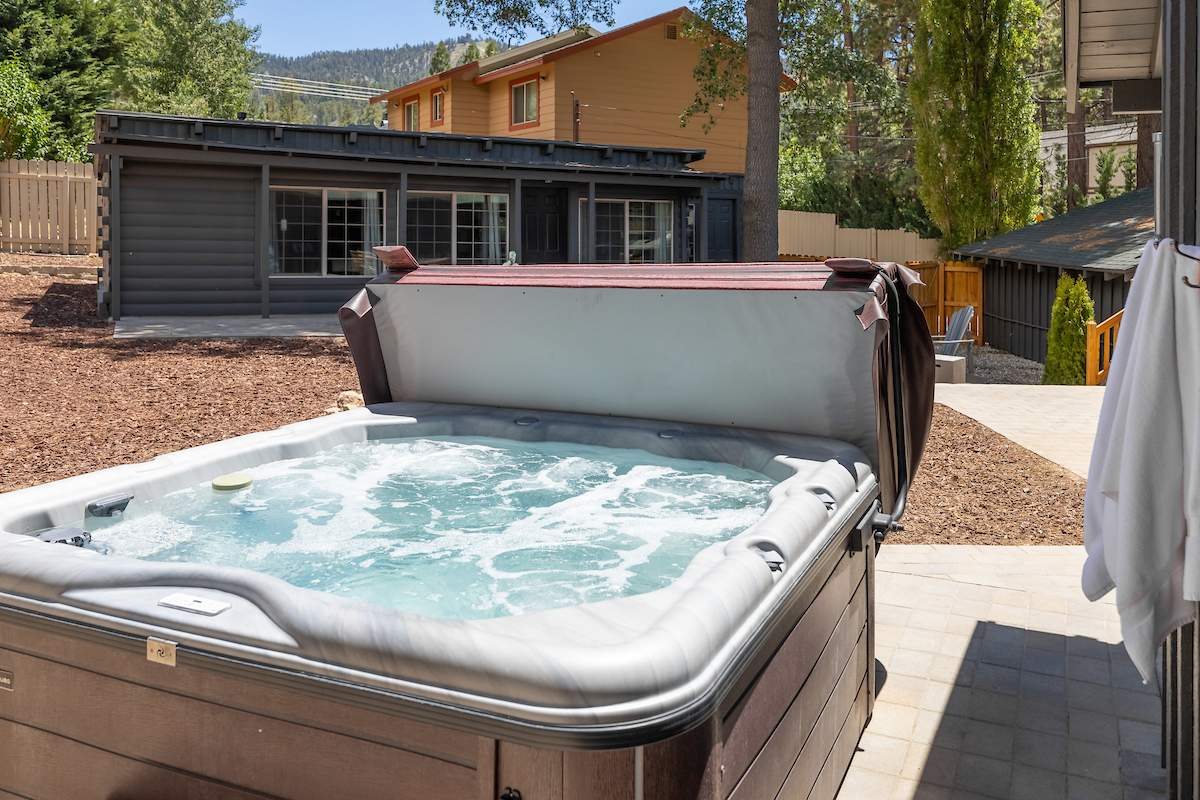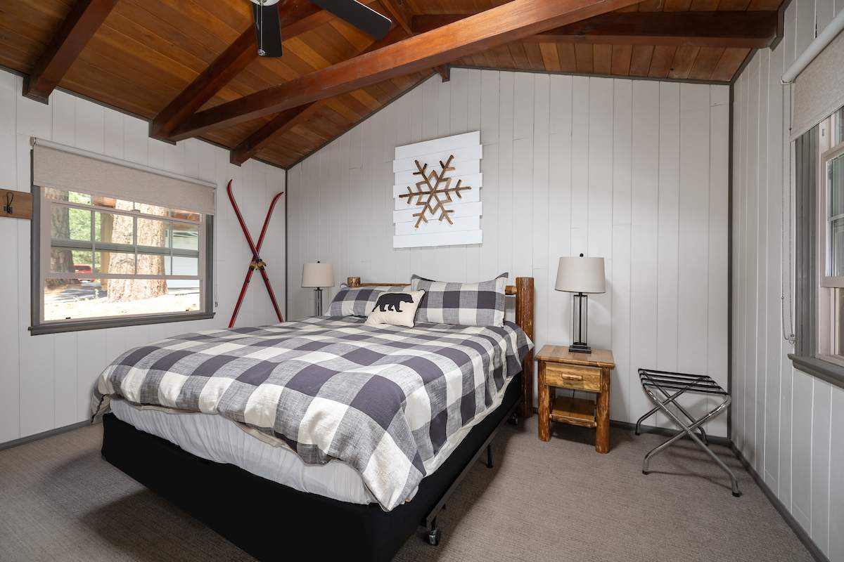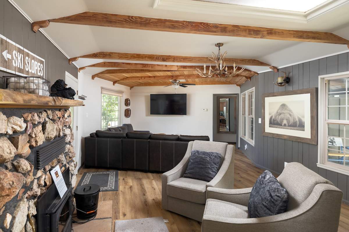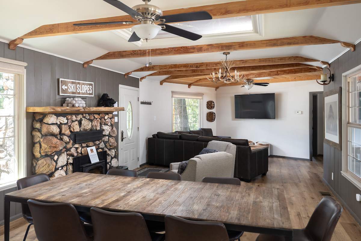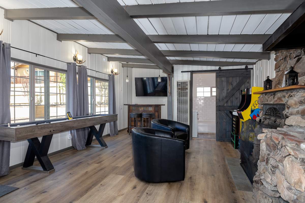 Sweet retreat! Prime Moonridge location right down the street from Bear Mountain resort and a chip shot from the golf course. This remodeled single-story beauty features an adorable guest cottage and sits on a fenced & landscaped nearly 1/3 acre. Awesome vacation home for multiple families/groups. Enjoy views of the ski slopes from the private courtyard while soaking in the spa or sitting around the fire pit under the stars. Main house features an open floor plan, 3 bedrooms and 2 baths. Living room has wood beam ceilings and a cozy rock fireplace w/efficient insert. Charming guest house has 1 bed, 1 bath, rock fireplace, and lots of windows. Improvements to the main house include new flooring, paint, windows, lighting, fixtures, laundry, and more. Guest house improvements include new roof, kitchenette, paint, flooring, barn door, bathroom, and more. Fenced courtyard w/new walkways, fire pit, and spa. Attached 2-car garage plus gravel driveway for additional parking. This is the one.