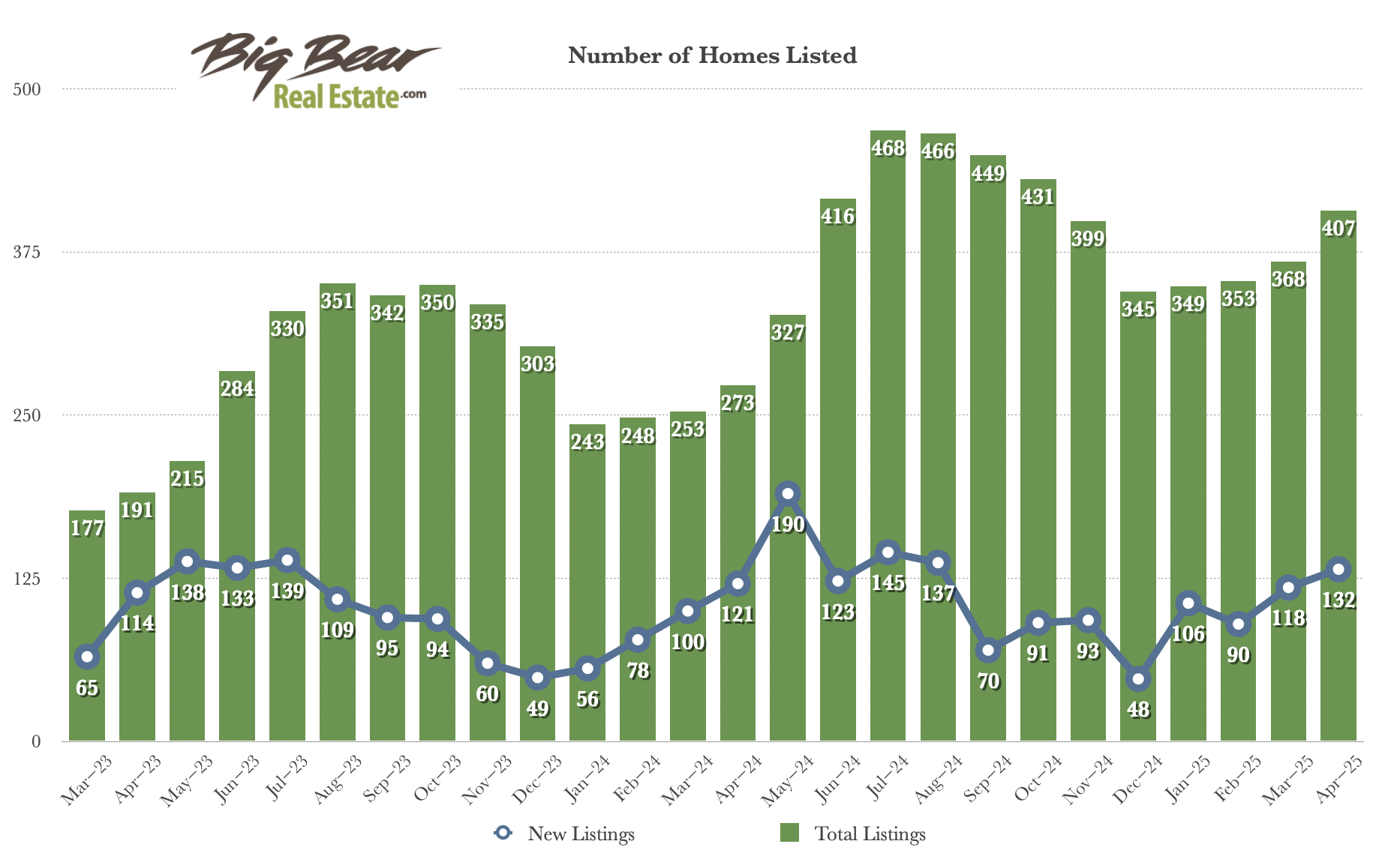 The average sales price of single family homes in Big Bear in April was up 17% compared to the previous month, and the median sales price was up 32%.  Average and median sales prices over Jan-Apr 2025 were relatively the same compared to Jan-Apr 2024.