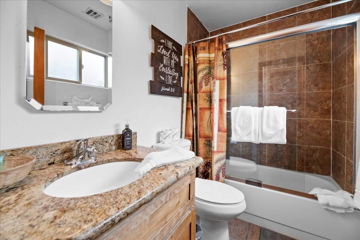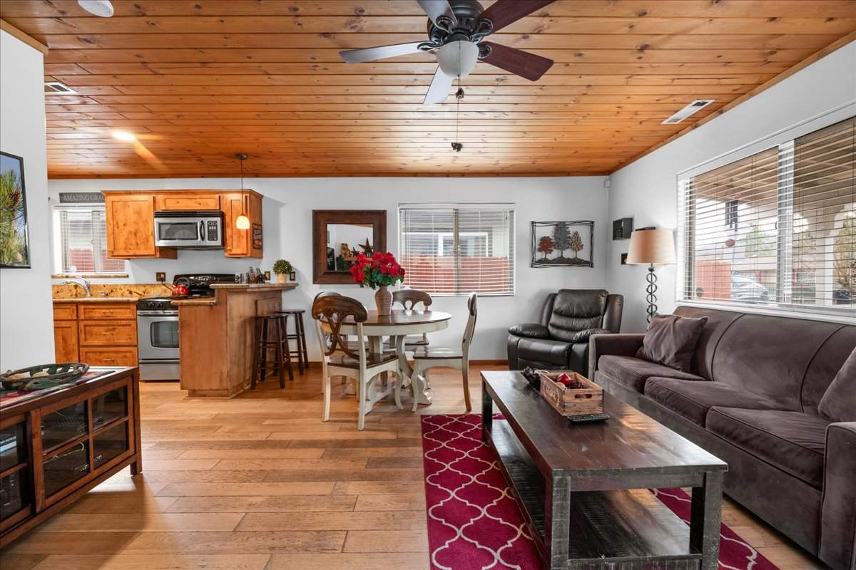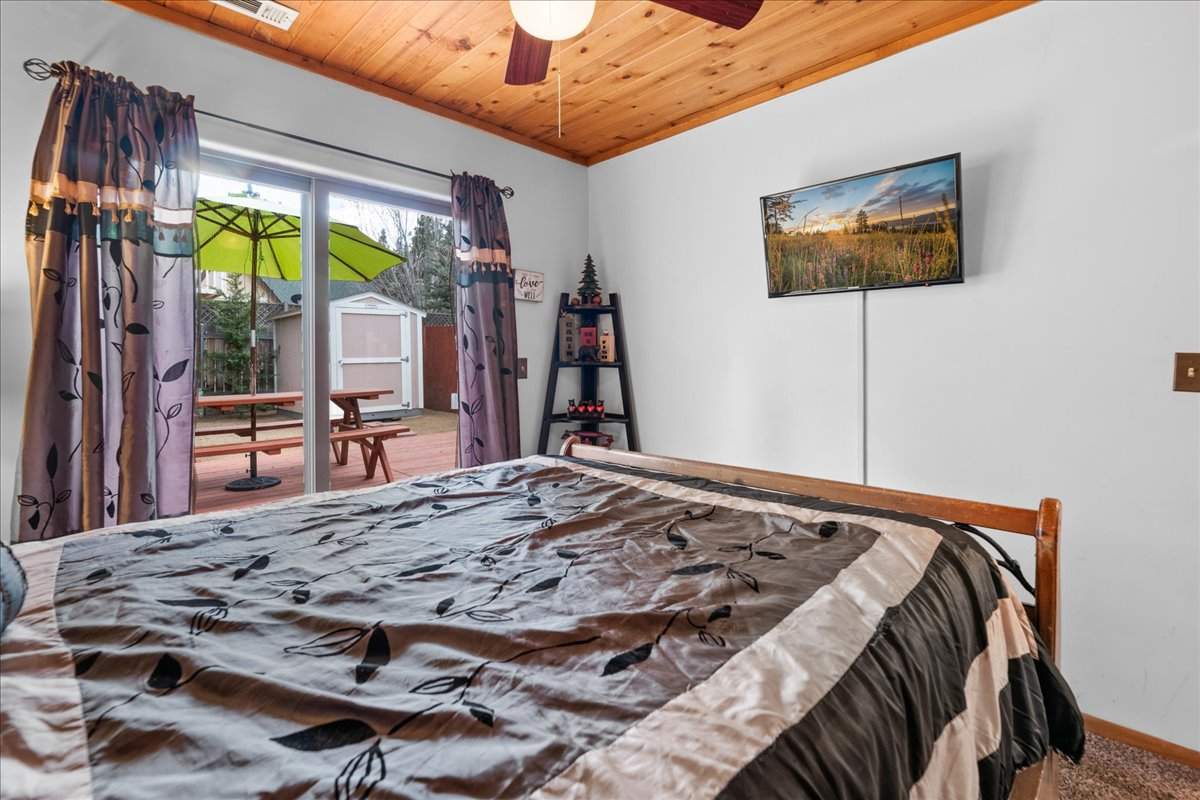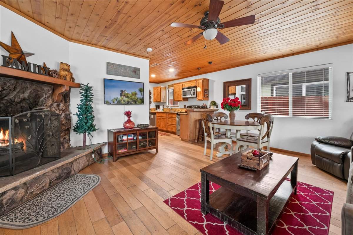 This adorable turnkey cabin is packed with charm, style, and modern upgrades. No detail was overlooked. Step inside to find the warm and welcoming open layout with rich wood floors and a cozy wood-burning fireplace. Beautiful T&G ceilings with recessed lighting in the kitchen, granite countertops, custom cabinetry, and stainless steel appliances. Stay comfortable year-round with efficient forced air heating, ceiling fans, a tankless water heater, and a stackable washer/dryer. Enjoy gorgeous mountain views from the front porch, or retreat to the backyard—your own peaceful mountain oasis—featuring a cedar fence, redwood deck, low-maintenance landscaping, and a Tuff Shed for extra storage. Level parking and easy access make it a perfect full-time home, vacation getaway, or rental property. All just minutes from the lake, ski slopes, shops, and everything else Big Bear has to offer. This one won’t last long!