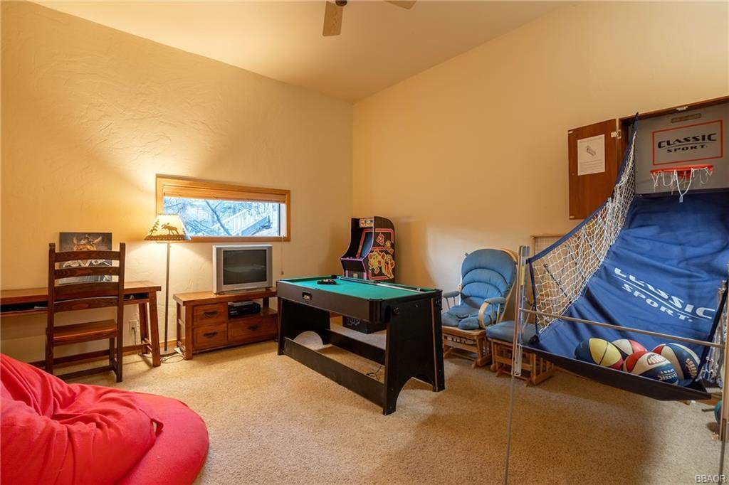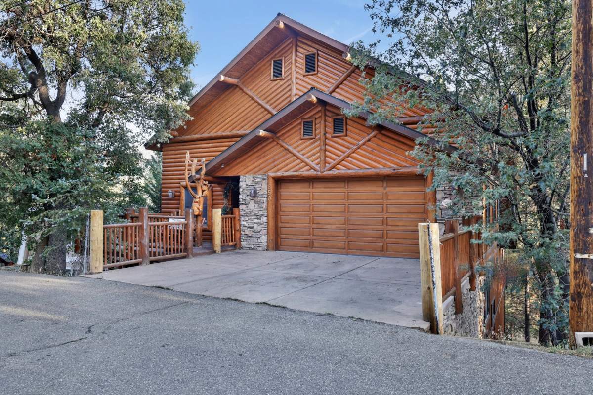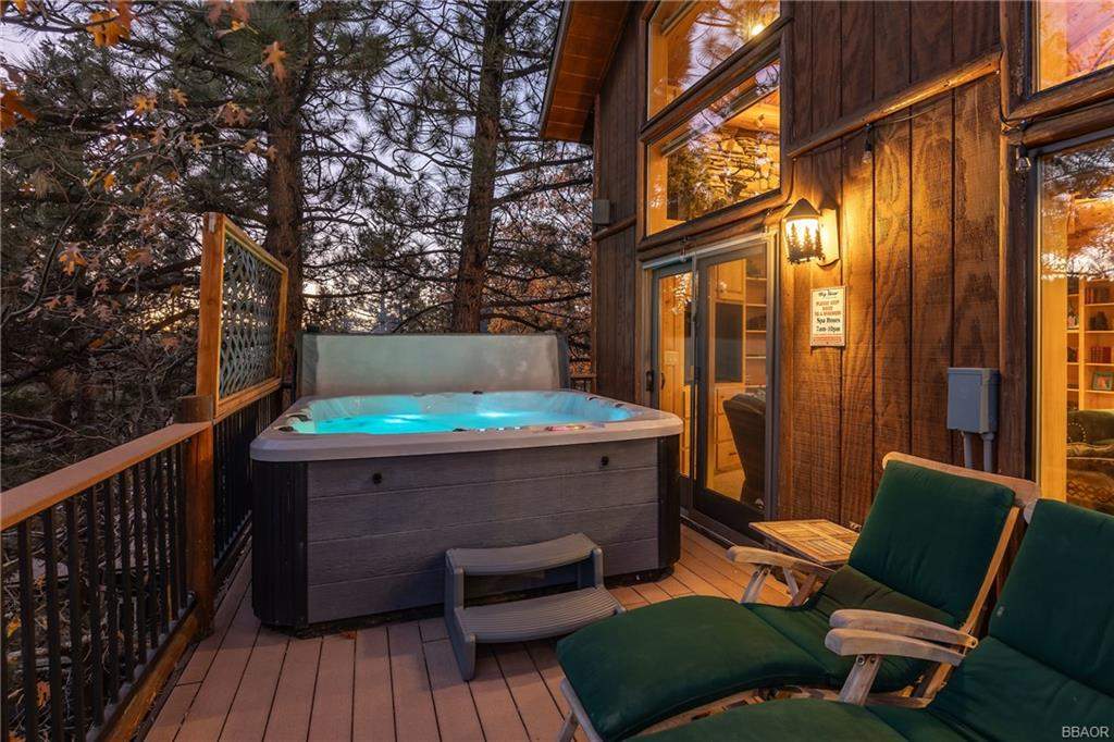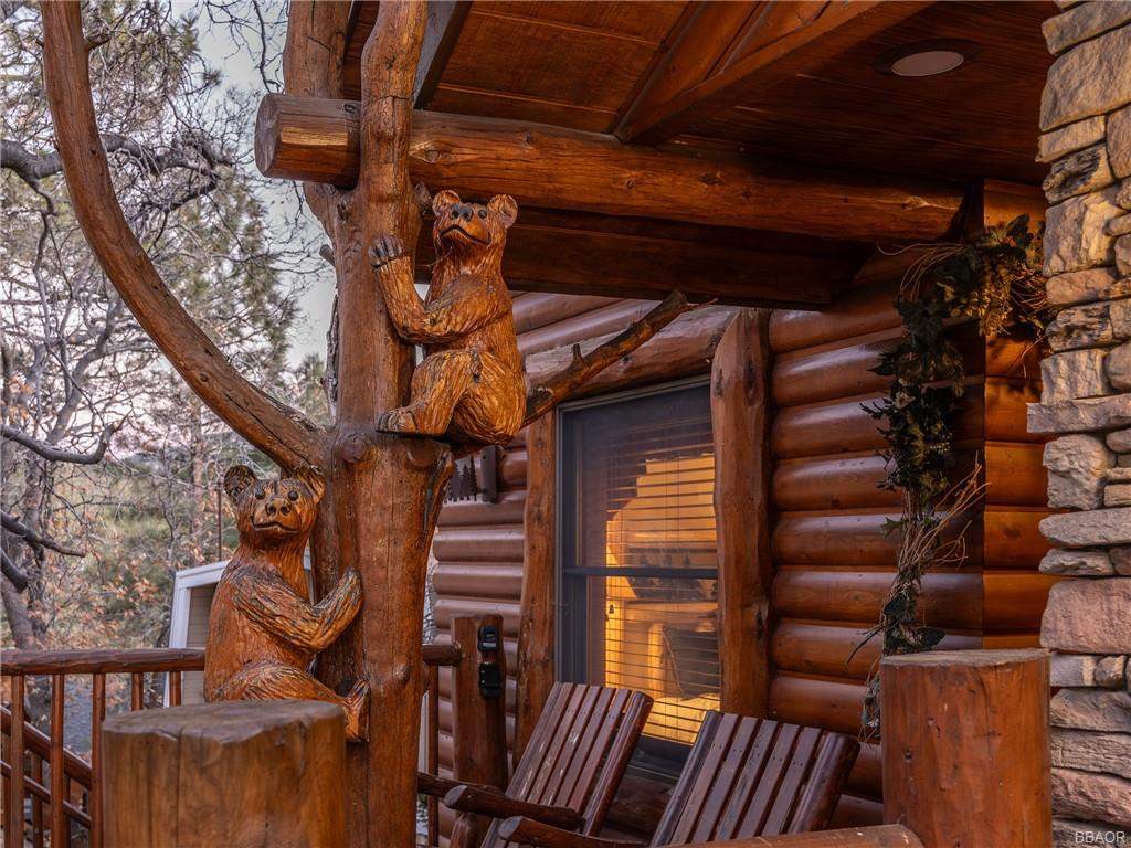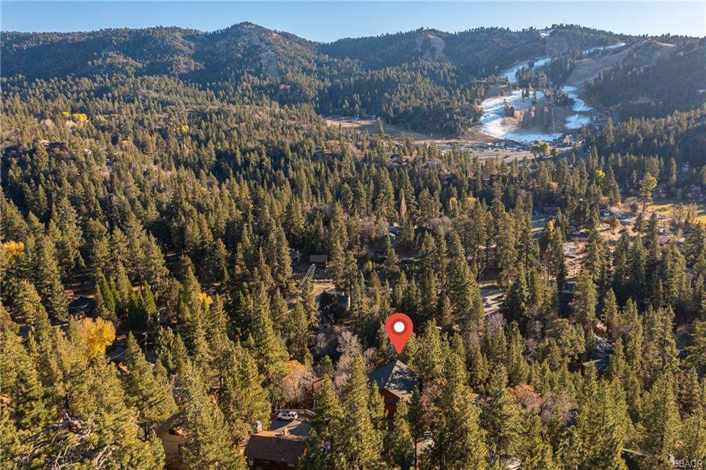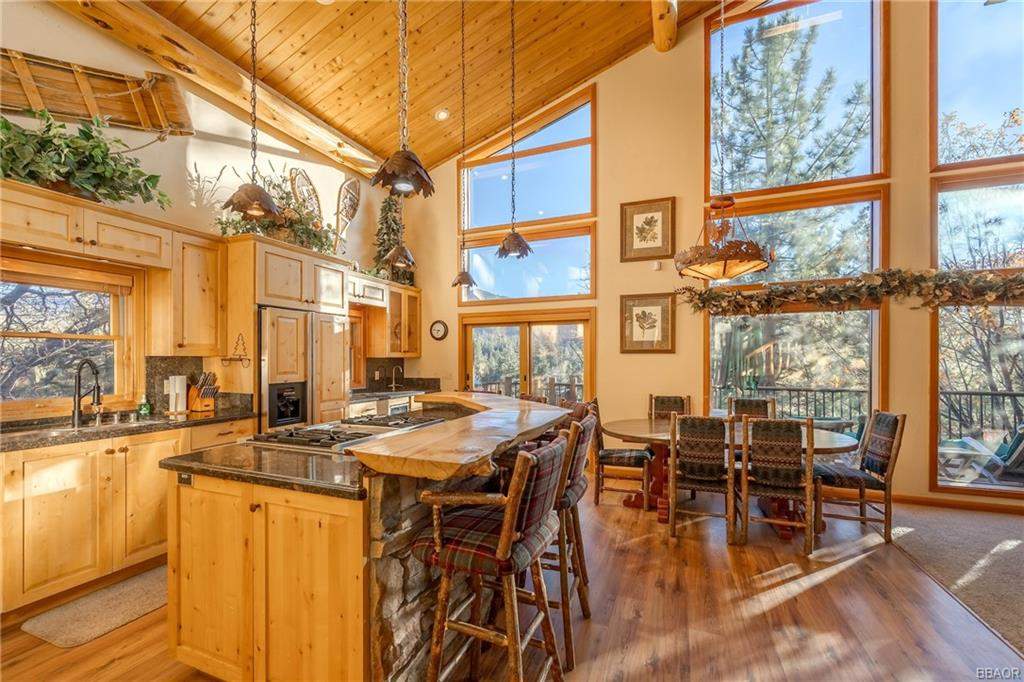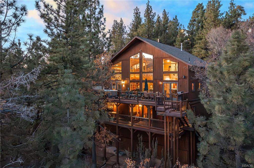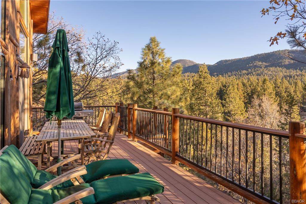 Check out this gorgeous custom log-style home with stunning panoramic views of the ski slopes. Situated in upper Moonridge offering a secluded tree-house feeling, though just minutes from the ski resorts, the lake, dining, and everything else Big Bear has to offer. The open great room floor plan features soaring beamed ceilings and an impressive wall of windows affording abundant natural light. Expertly equipped gourmet kitchen is outfitted with Viking cooktop range/griddle, double oven, and other high-end appliances. Wraparound island with wood slab and pendant lighting, granite countertops and beautiful custom cabinetry plus additional prep sink make entertaining a breeze. Enjoy outdoor living out on the multi level decks, take in views of Bear Mountain and the surrounding ridgeline. Soak in the spa under the stars after a long day on the slopes. Plenty of living space for the whole gang with 4 bedrooms, 3 baths, plus a loft and a bonus/game room. Master suite has access to lower level deck, walk-in closet, master bath has luxurious jetted tub, large glass surround shower, and dual vanities. Separate laundry room with tile counter tops and many cupboards. Property offers easy all-season access, level entry and parking with a street-level 2-car attached garage. This property has all the makings of a dream mountain getaway and/or successful vacation rental investment property.