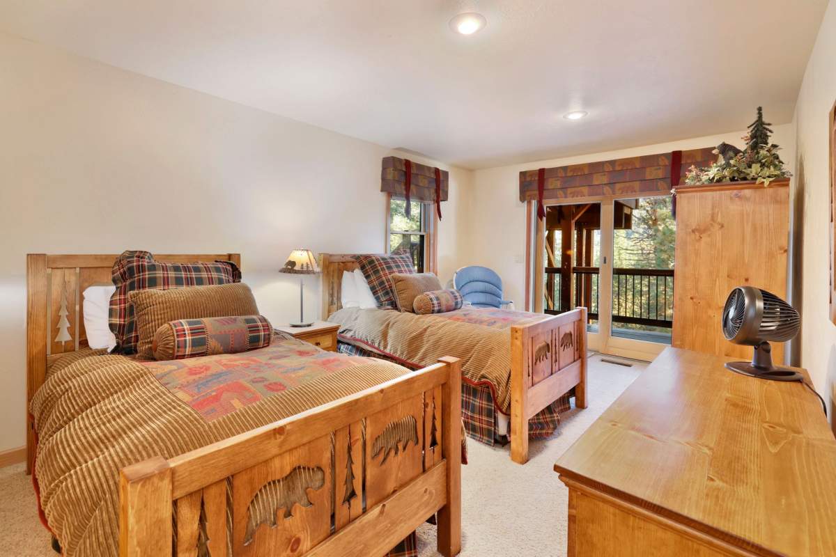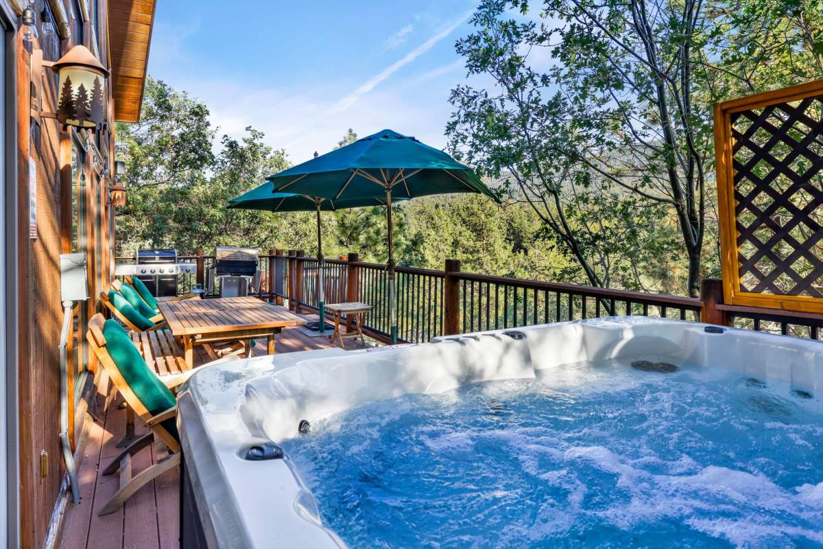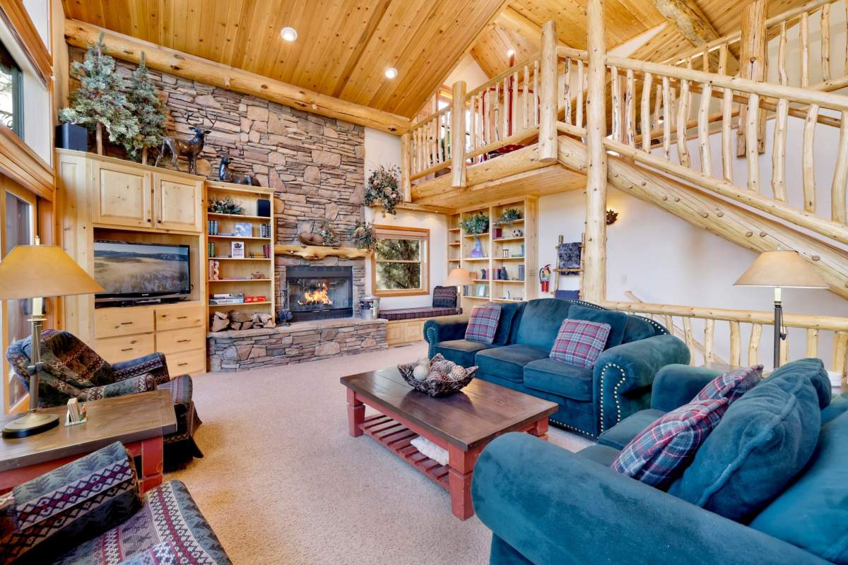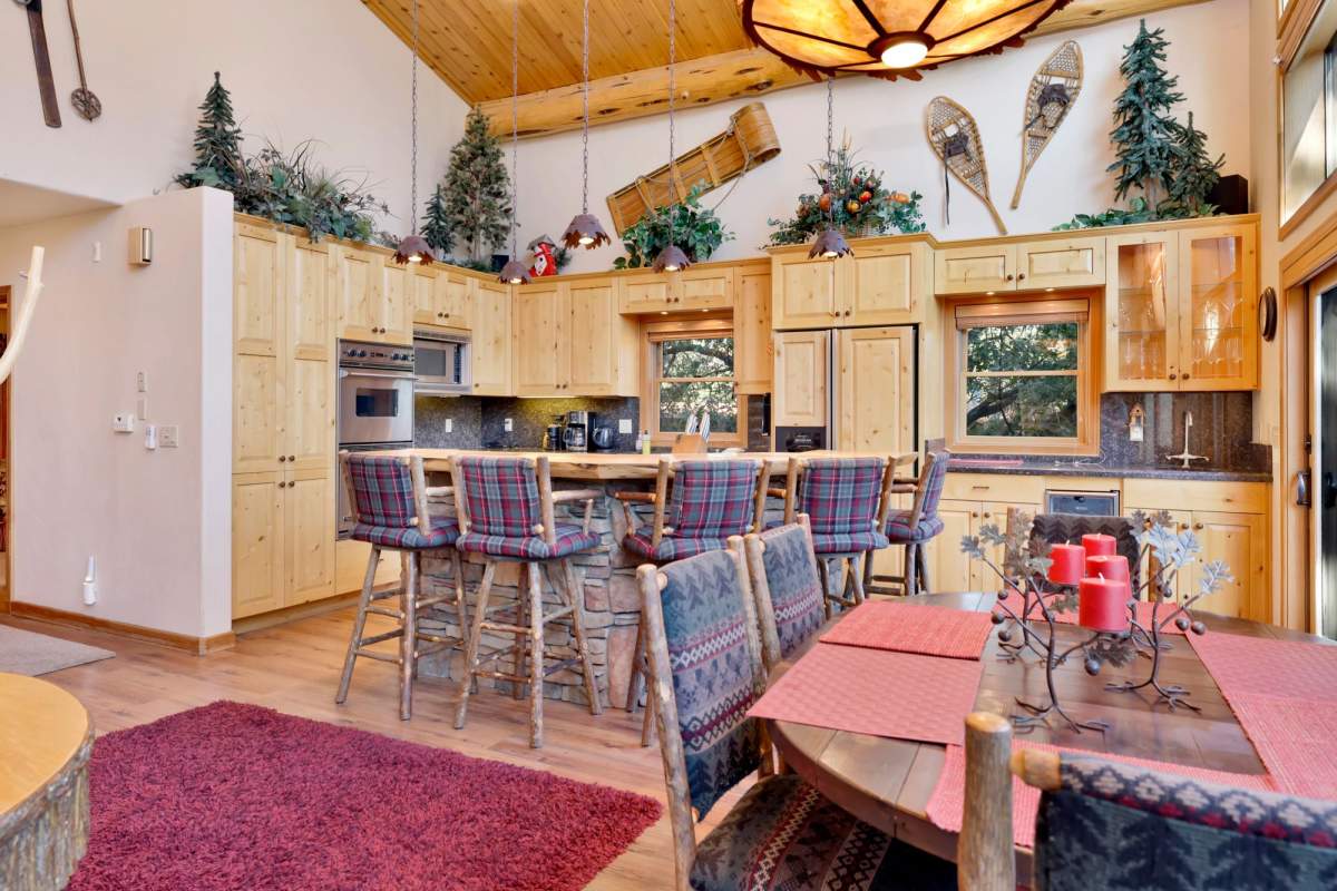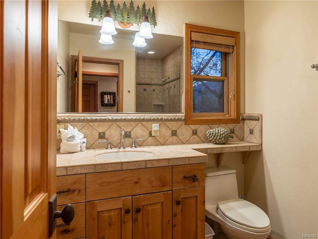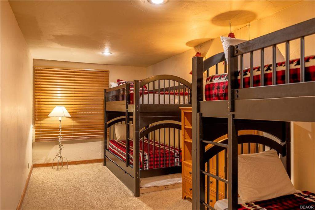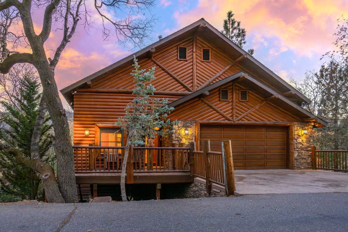 Check out this gorgeous custom log-style home with stunning panoramic views of the ski slopes. Situated in upper Moonridge offering a secluded tree-house feeling, though just minutes from the ski resorts, the lake, dining, and everything else Big Bear has to offer. The open great room floor plan features soaring beamed ceilings and an impressive wall of windows affording abundant natural light. Expertly equipped gourmet kitchen is outfitted with Viking cooktop range/griddle, double oven, and other high-end appliances. Wraparound island with wood slab and pendant lighting, granite countertops and beautiful custom cabinetry plus additional prep sink make entertaining a breeze. Enjoy outdoor living out on the multi level decks, take in views of Bear Mountain and the surrounding ridgeline. Soak in the spa under the stars after a long day on the slopes. Plenty of living space for the whole gang with 4 bedrooms, 3 baths, plus a loft and a bonus/game room. Master suite has access to lower level deck, walk-in closet, master bath has luxurious jetted tub, large glass surround shower, and dual vanities. Separate laundry room with tile counter tops and many cupboards. Property offers easy all-season access, level entry and parking with a street-level 2-car attached garage. This property has all the makings of a dream mountain getaway and/or successful vacation rental investment property.